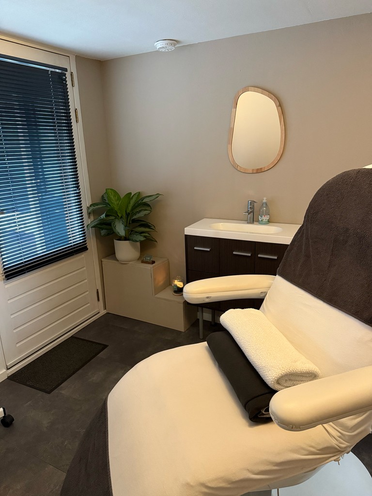 Een kijkje in mijn salon. Neem heerlijk plaats op mijn (verwarmde) behandelingsstoel voor een gezichtsbehandeling of pedicure of kom lekker liggen op mijn massagetafel voor een ontspannende of klachtgerichte massage.